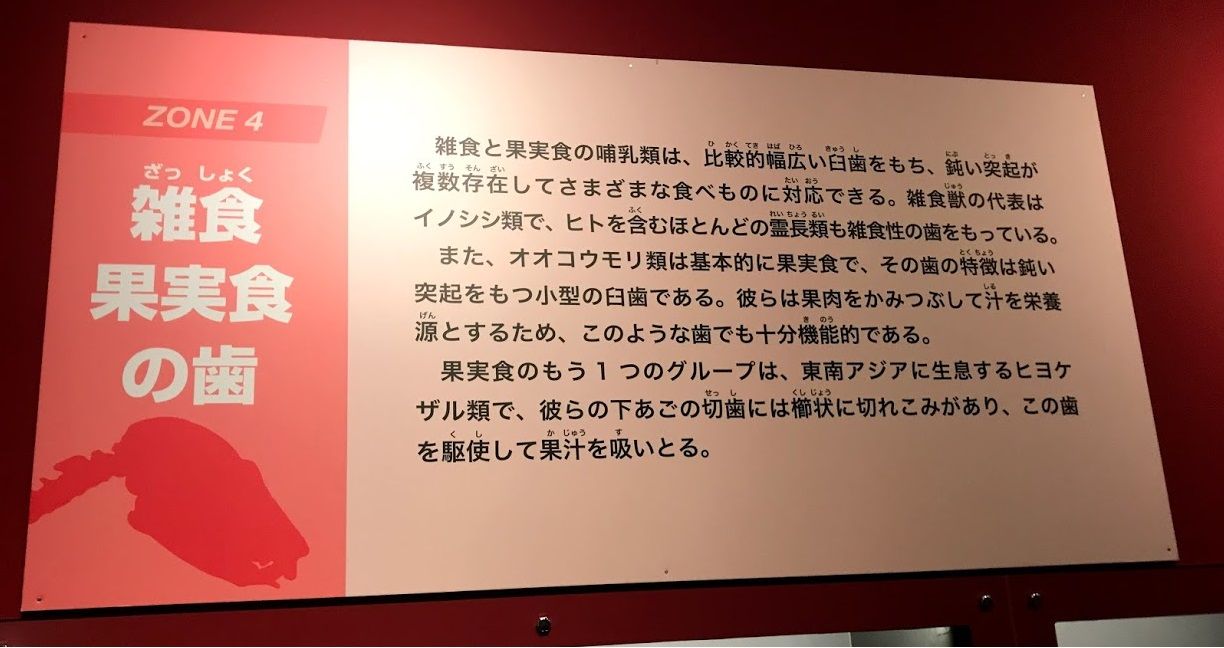 「命をつなぐための工夫」の性器展示ですが、それまでの展示に比べて説明が小難しく感じられました。例えばこちらは「歯やあごを見比べ」という展示にある説明です。